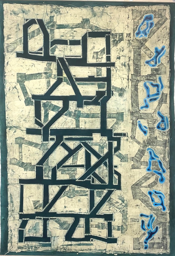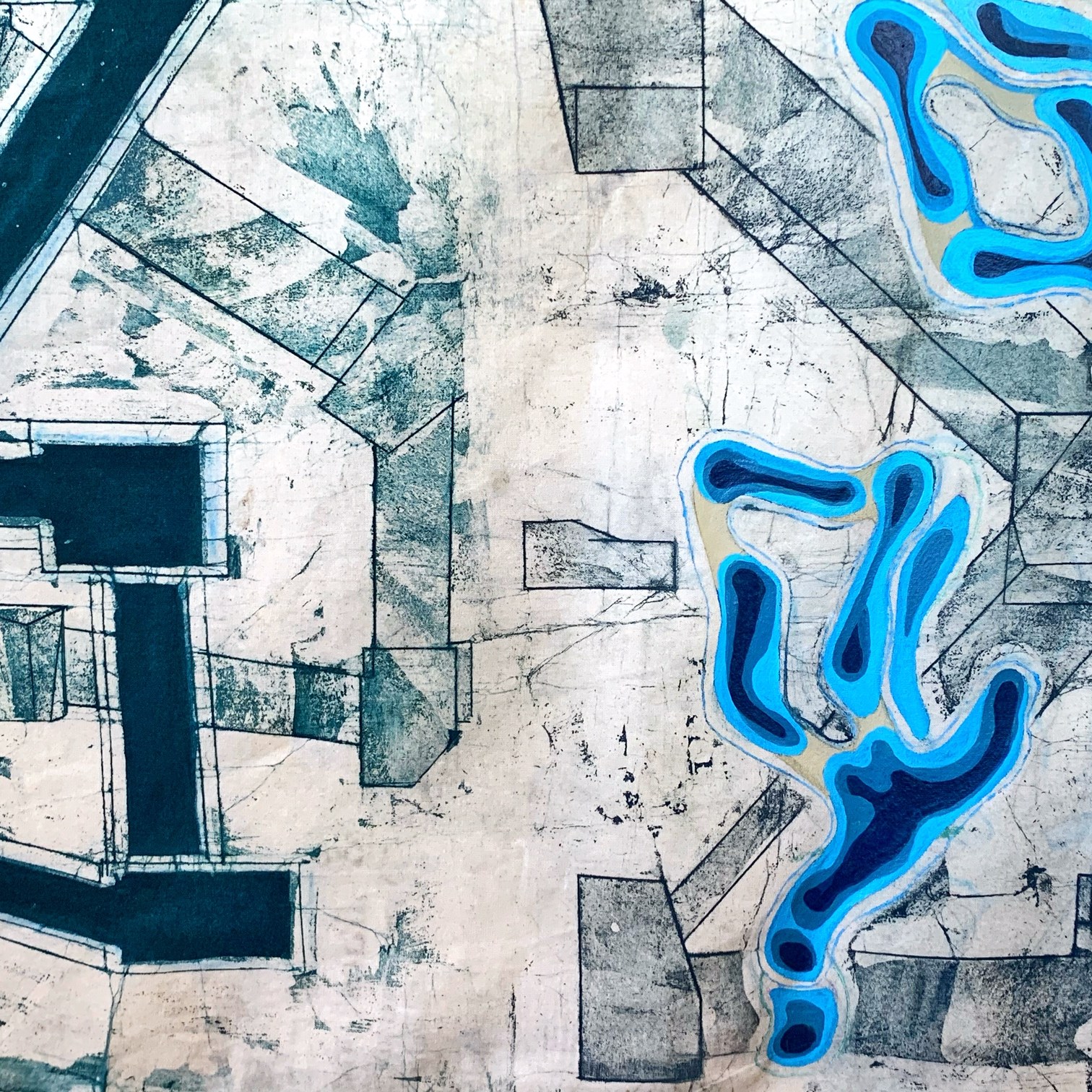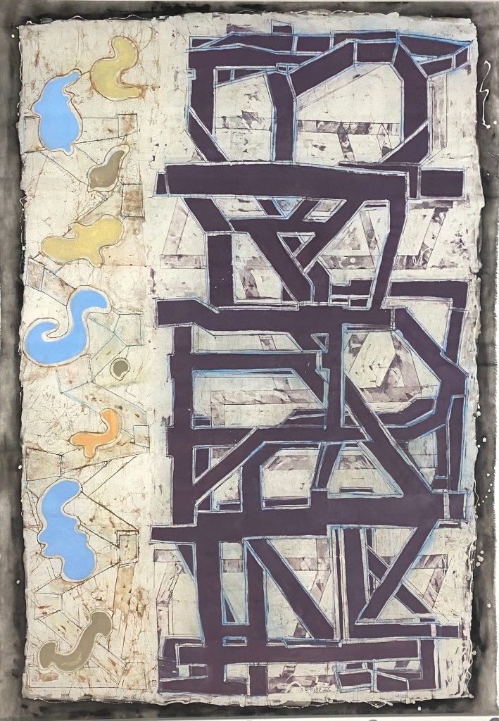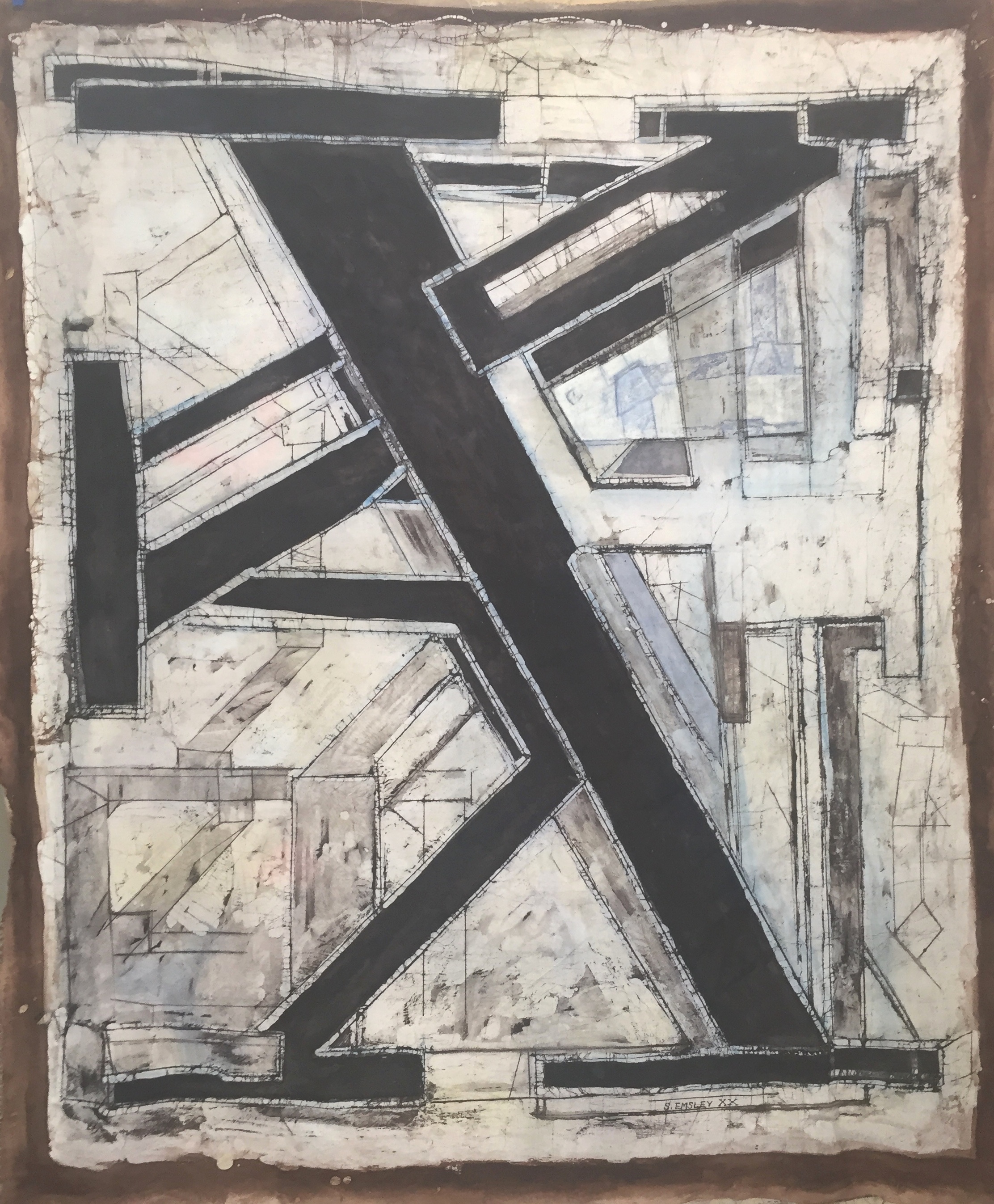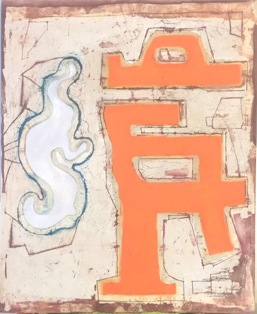I regard the work as strictly abstract in nature. That is to say it is not intended to allude to a spiritual or emotional realm – to represent – at least not consciously. My starting points revolve around the processes of making, the illusion of space and its negation, the satisfaction the eye gains from examining structure, interplay between hard and soft line, and the juxtaposition of the austere rectilinear forms with frivolous organic shapes and colours . Composition has also reasserted itself as a priority as a by-product of interest in structure. All these interests are marshalled through the prerogative of the eye: its desire to seek out rules, to group and set apart, to insist on maintaining its vertical/horizontal plumb-bob even in this two dimensional world and to sense both illusion and allusion. My work method also allows me to enjoy seeing the traces of past applications of wax re-emerge to echo and document the making process. And to constantly surprise me with its outcomes and inventions.