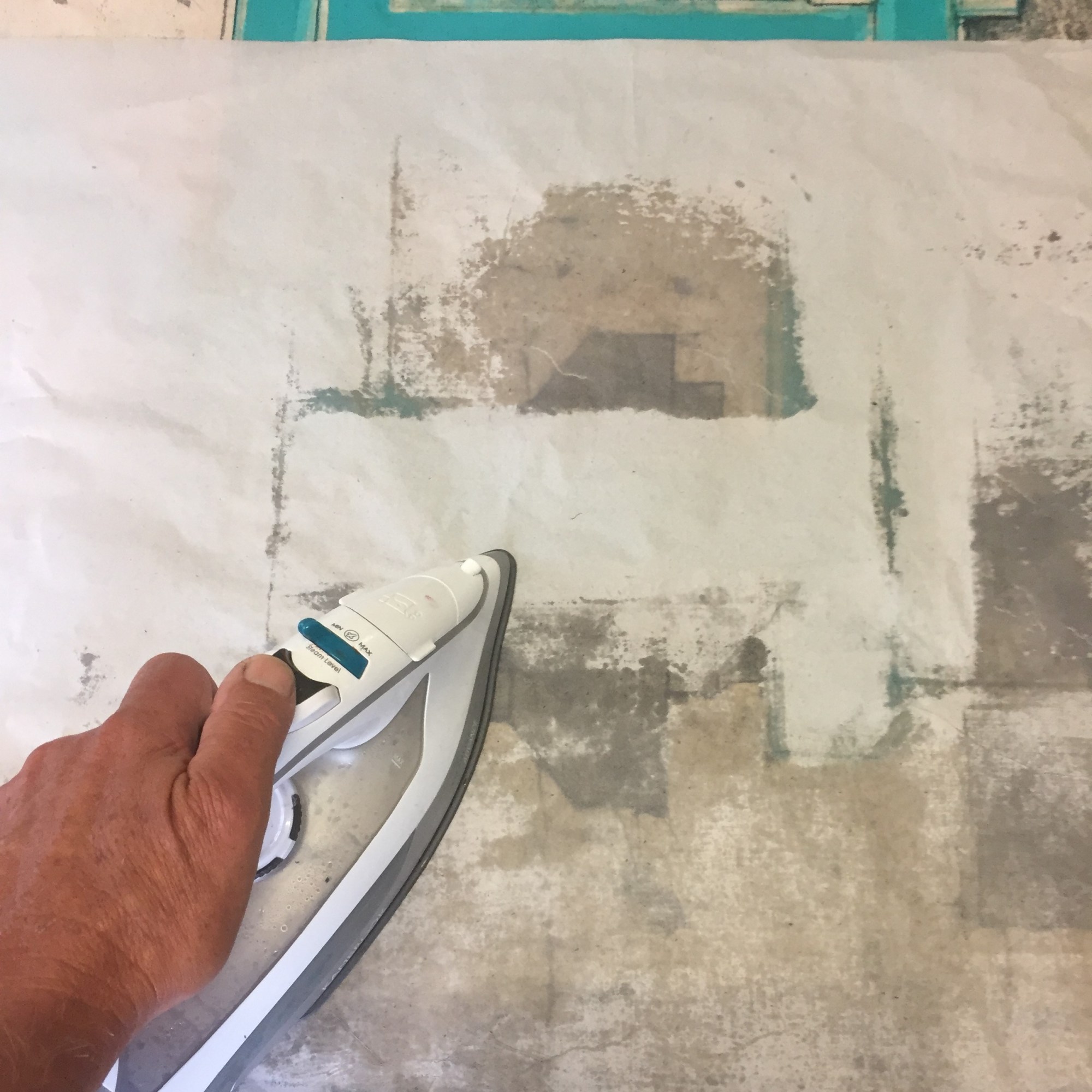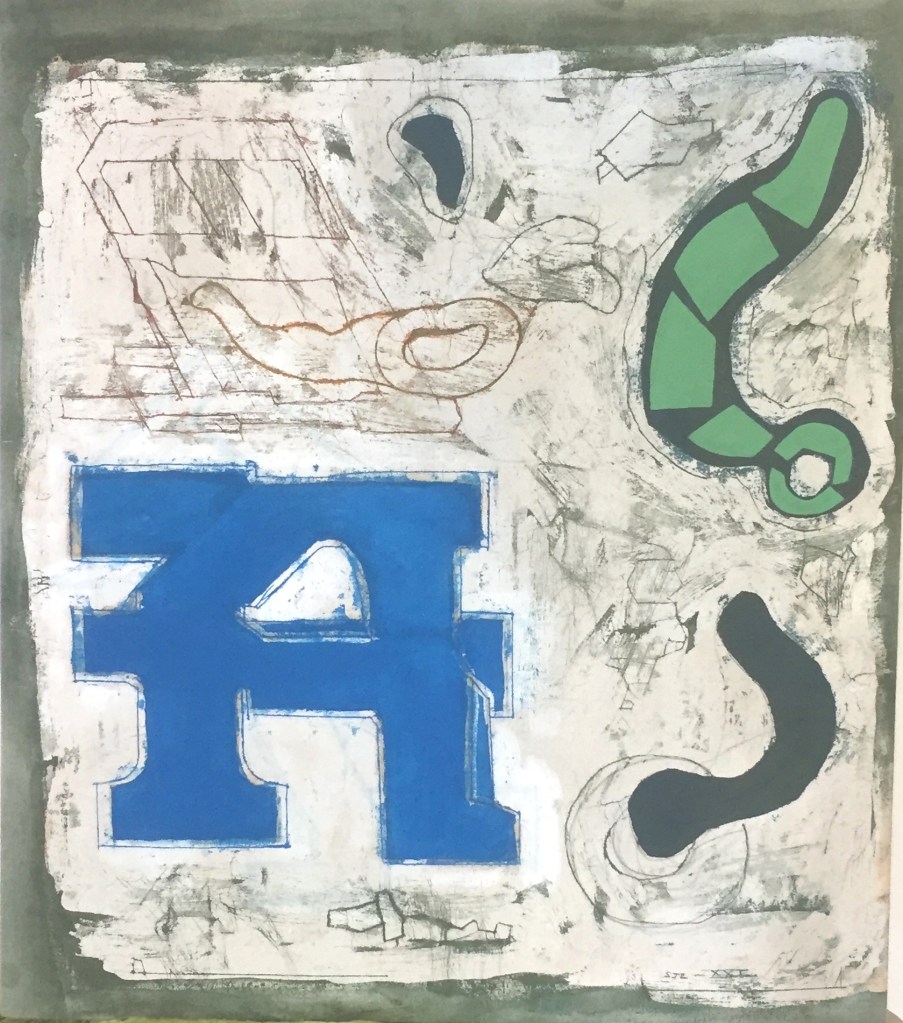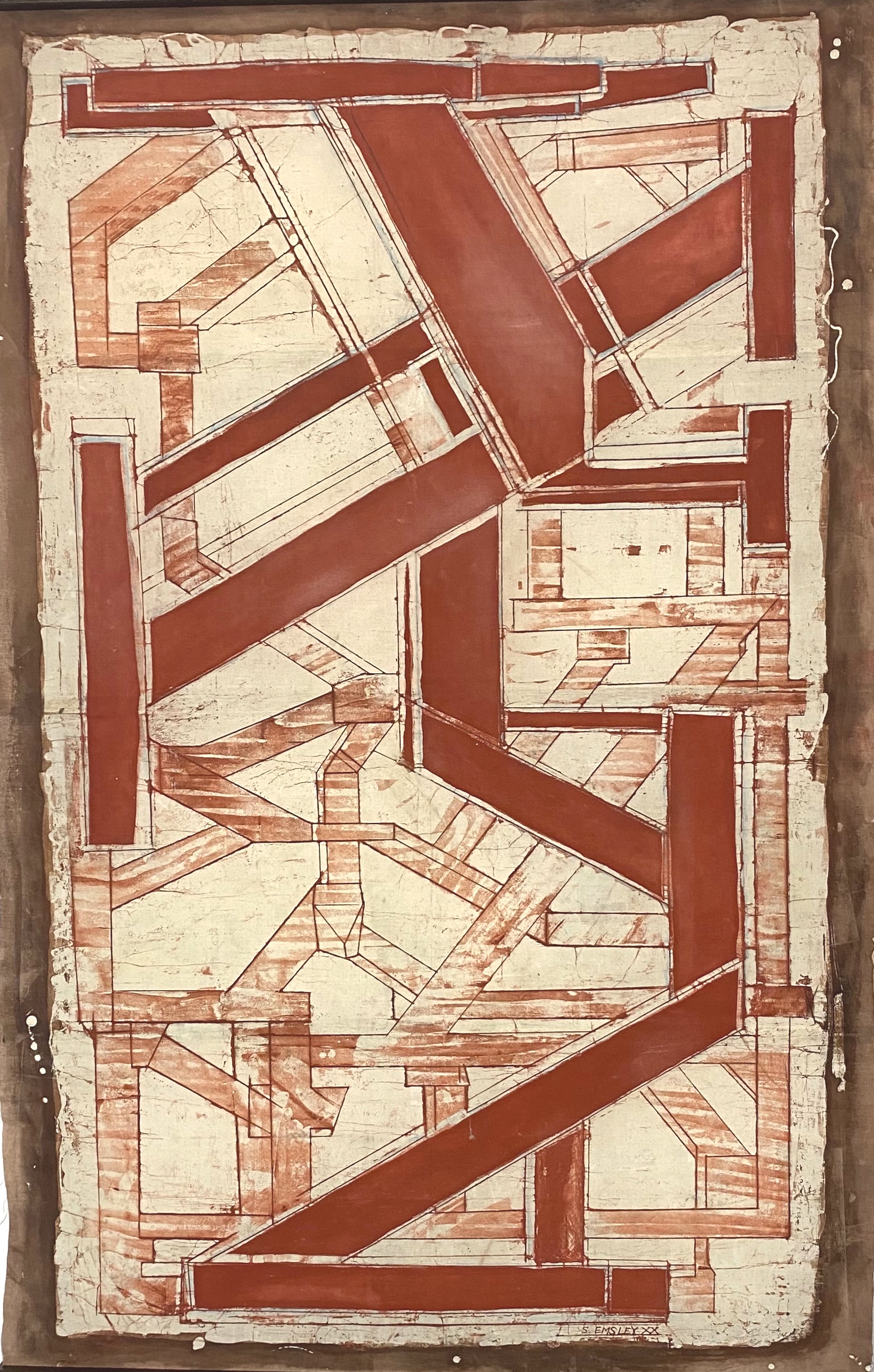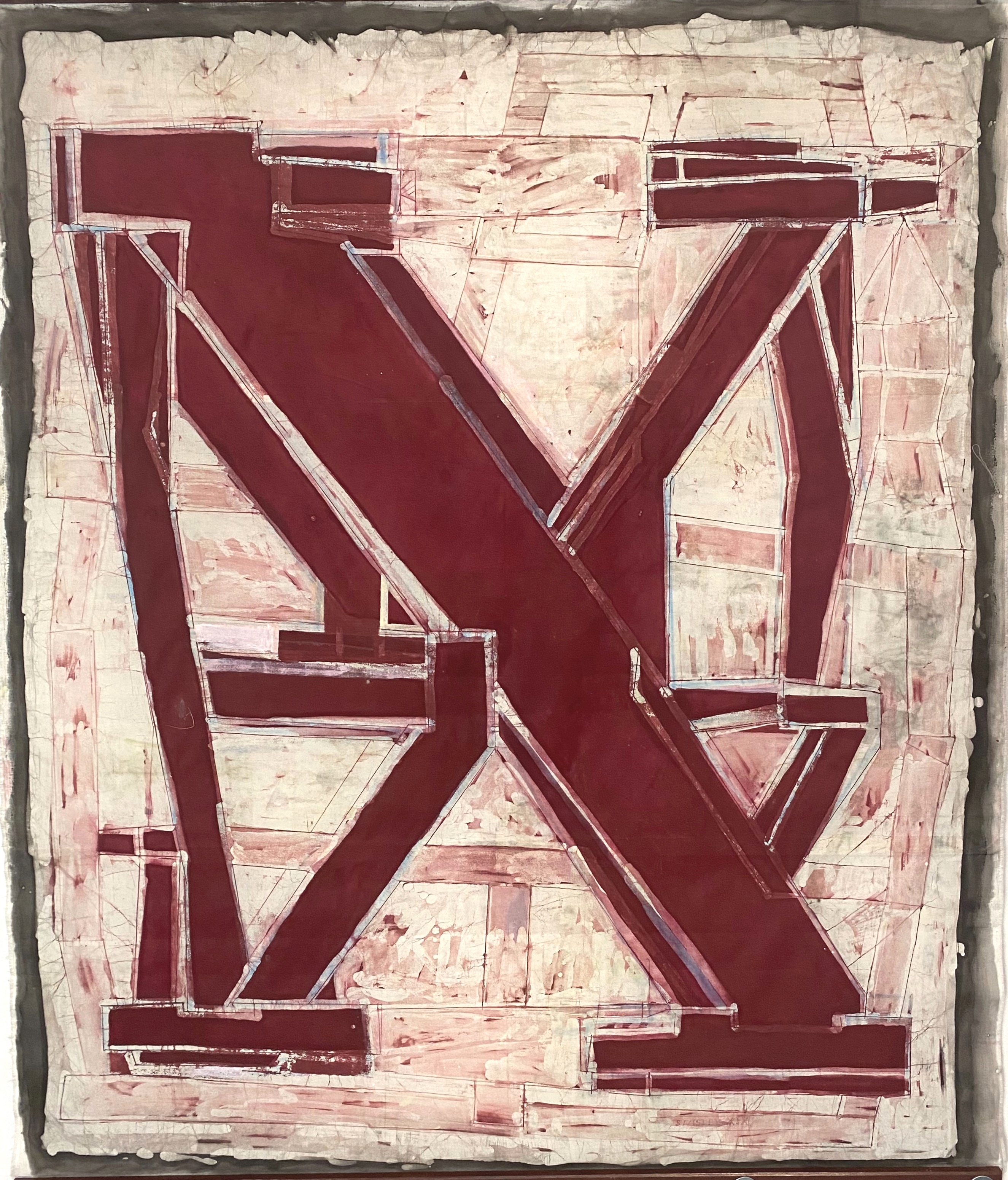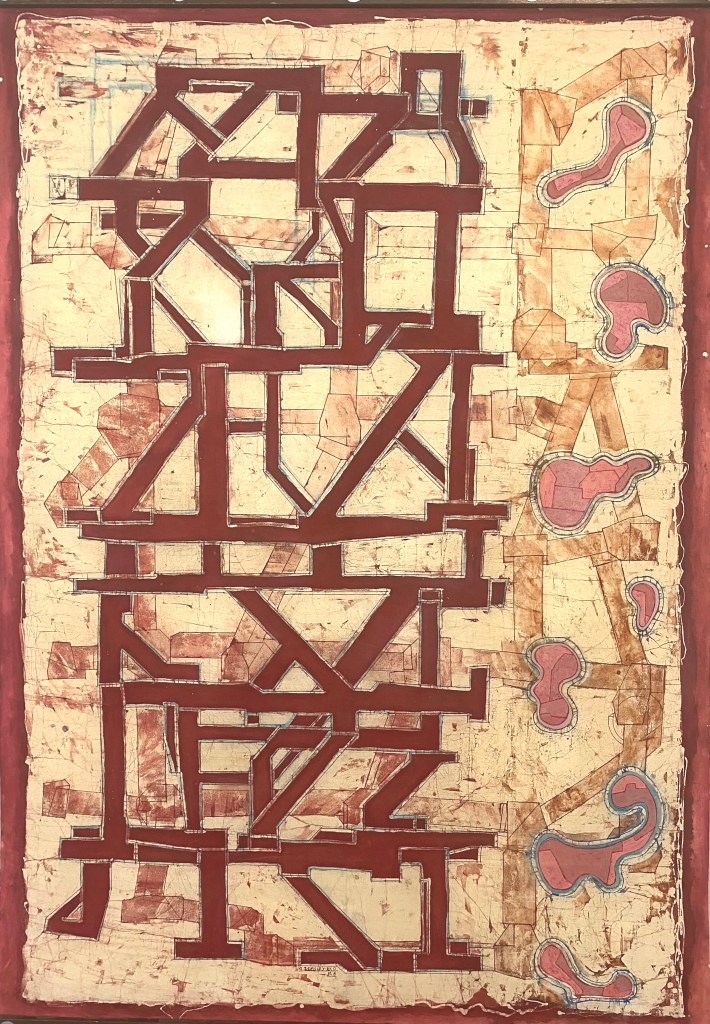 I regard the work as strictly abstract in nature. That is to say it is not intended to allude to a spiritual or emotional realm – to represent – at least not consciously. My starting points revolve around the processes of making, the illusion of space and its negation, the satisfaction the eye gains from examining structure, interplay between hard and soft line, and the juxtaposition of the austere rectilinear forms with frivolous organic shapes and colours . Composition has also reasserted itself as a priority as a by-product of interest in structure. All these interests are marshalled through the prerogative of the eye: its desire to seek out rules, to group and set apart, to insist on maintaining its vertical/horizontal plumb-bob even in this two dimensional world and to sense both illusion and allusion. My work method also allows me to enjoy seeing the traces of past applications of wax re-emerge to echo and document the making process. And to constantly surprise me with its outcomes and inventions.