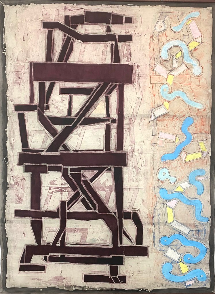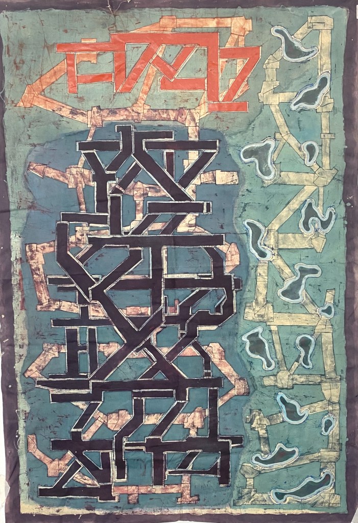 Like many works in batik-related fields, mine has been executed on calico or cotton and was exhibited unstretched as wall-hangings. I personally like this form of presentation, emphasising as it does the two dimesionality of the surface. The material support has been reinforced with a polymer size and a flexible sealant on the back. Additional rigidity is provided by lightweight horizontal batons (20x5mm).